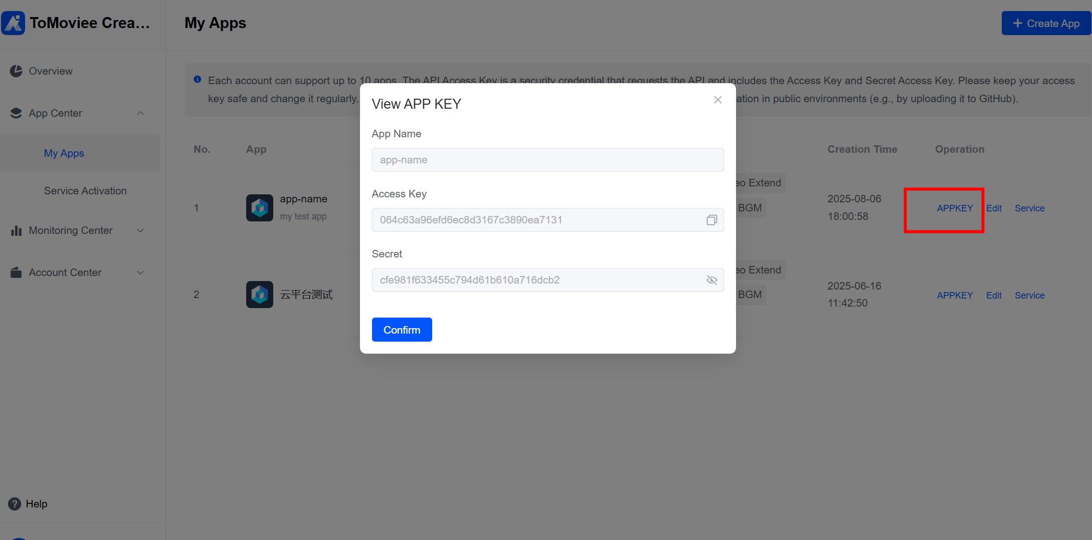 Step 4: Get App KeysBefore calling the services of ToMoviee Creative Engine, make sure you have created an application. This is necessary to generate an Access Key pair at the application level. The Access Key pair is a security credential required for making API requests and consists of an Access Key and a Secret Access Key. Please store your keys securely and rotate them regularly. Do not share or expose them in public environments (such as uploading to GitHub) to ensure the security of your cloud resources.