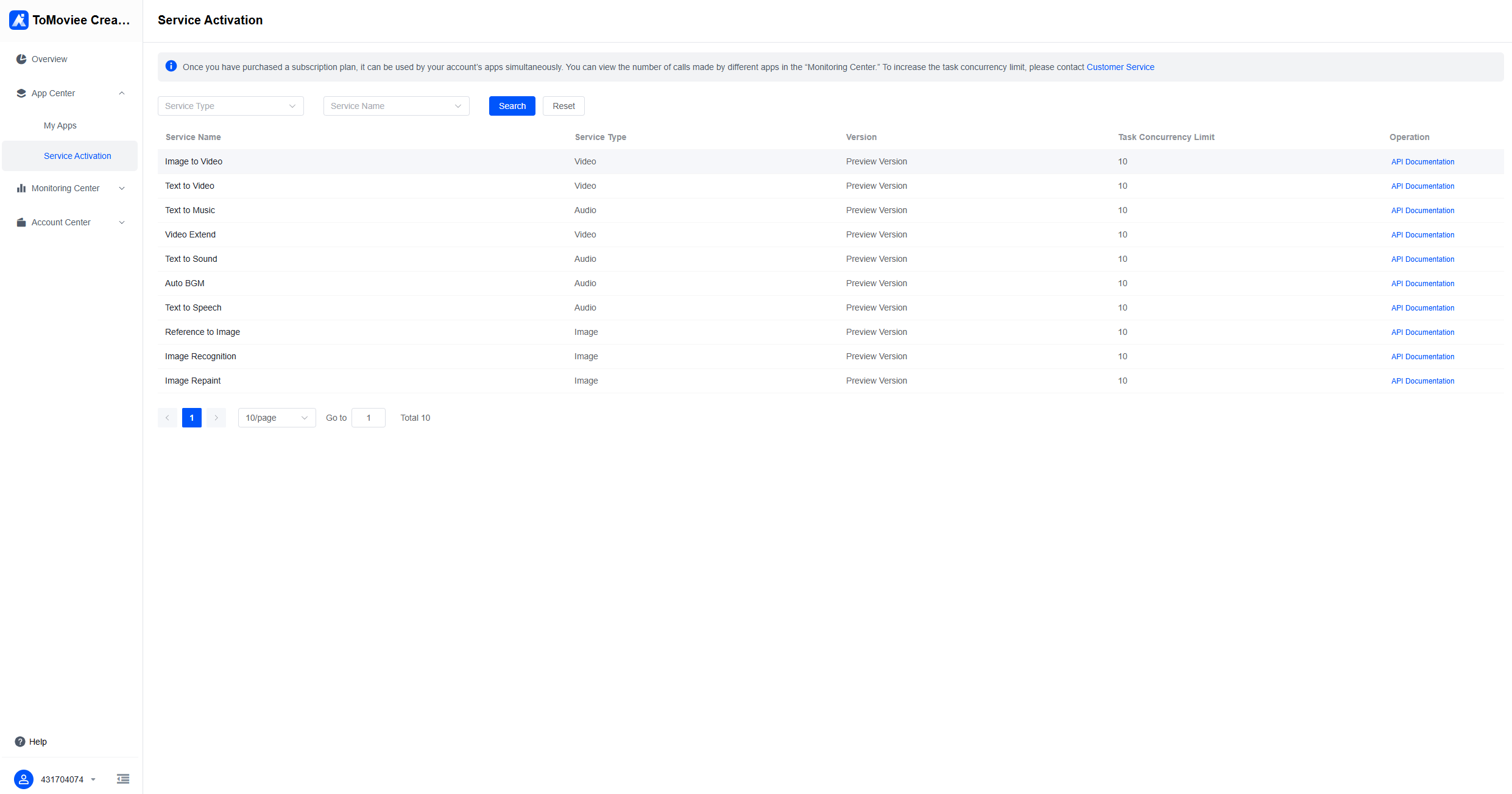 ToMoviee Creative Engine grants users access to all services by default. You can go to “Application Center” > “Service Activation” to view details, integration guide, and credit consumption plans for each service.